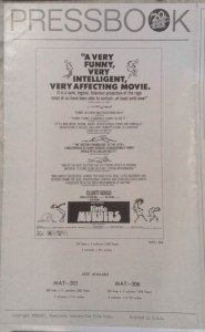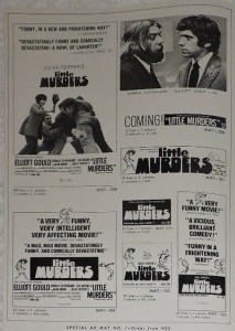 Images from a couple eBay listings of the Little Murders pressbook give an idea of what Ben was trying to show Anna as to how the film was being marketed. Not specifically the Feiffer dancing/writhing people in the giant 3-column ad, and the photo of Sutherland and Gould implying, without stating, a M*A*S*H connection. Another version of the first image can be found here.