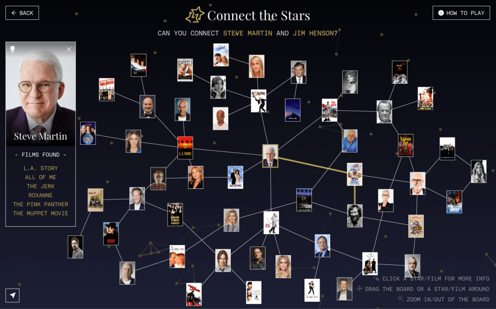 The strings of connectivity between Steve Martin and Jim Henson through his Top 4 on IMDB, as depicted on Connect The Stars, looks a little like this: